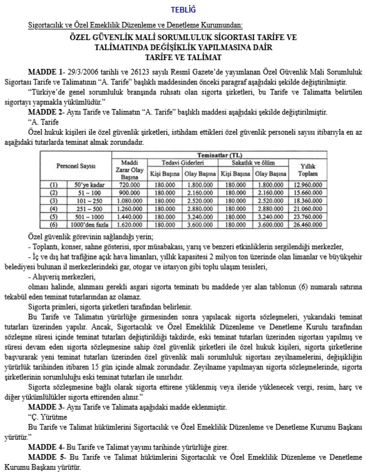 Buna göre 29 Mart 2006’da yayımlanan orijinal talimatta yapılan değişiklikler, özel güvenlik şirketleri ve özel hukuk kişilerinin sigorta yükümlülüklerini düzenledi.